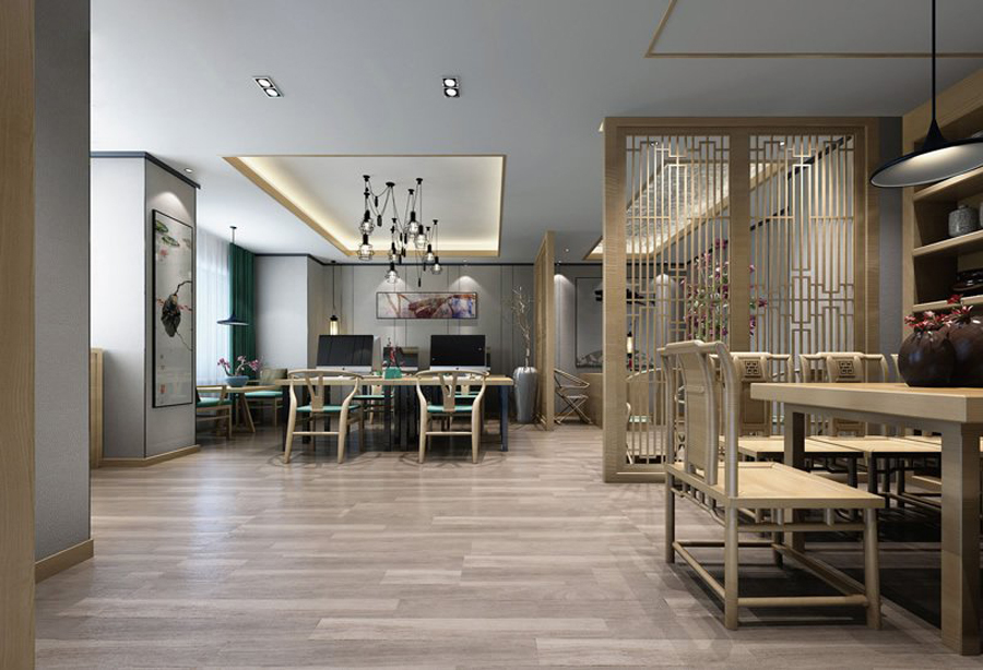 和式木吊頂由線匯成面的構成關系產生出音樂意境般的空間效果,結合橡木本色肌理和天然材料的特定氣息,自然光影與色調、抽象與簡潔給人以平和、美好的感覺。