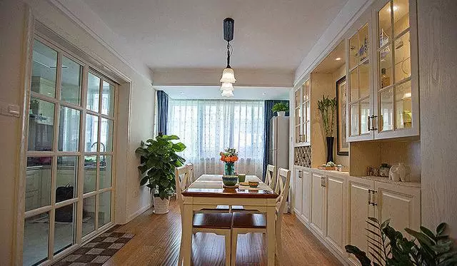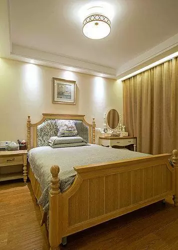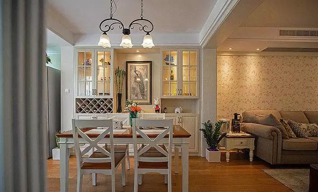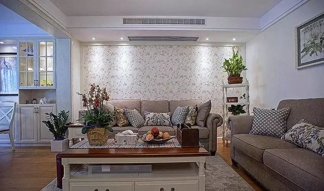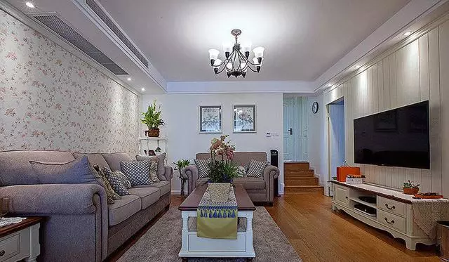 偏向美式風格,后期軟裝的時候把小碎花的元素融入其中,看起來還是挺少女的哦;沙發背景使用白色木質線框,內部碎花墻紙;電視背景墻采用象牙白木飾面背景,衛生間門采用隱形門
